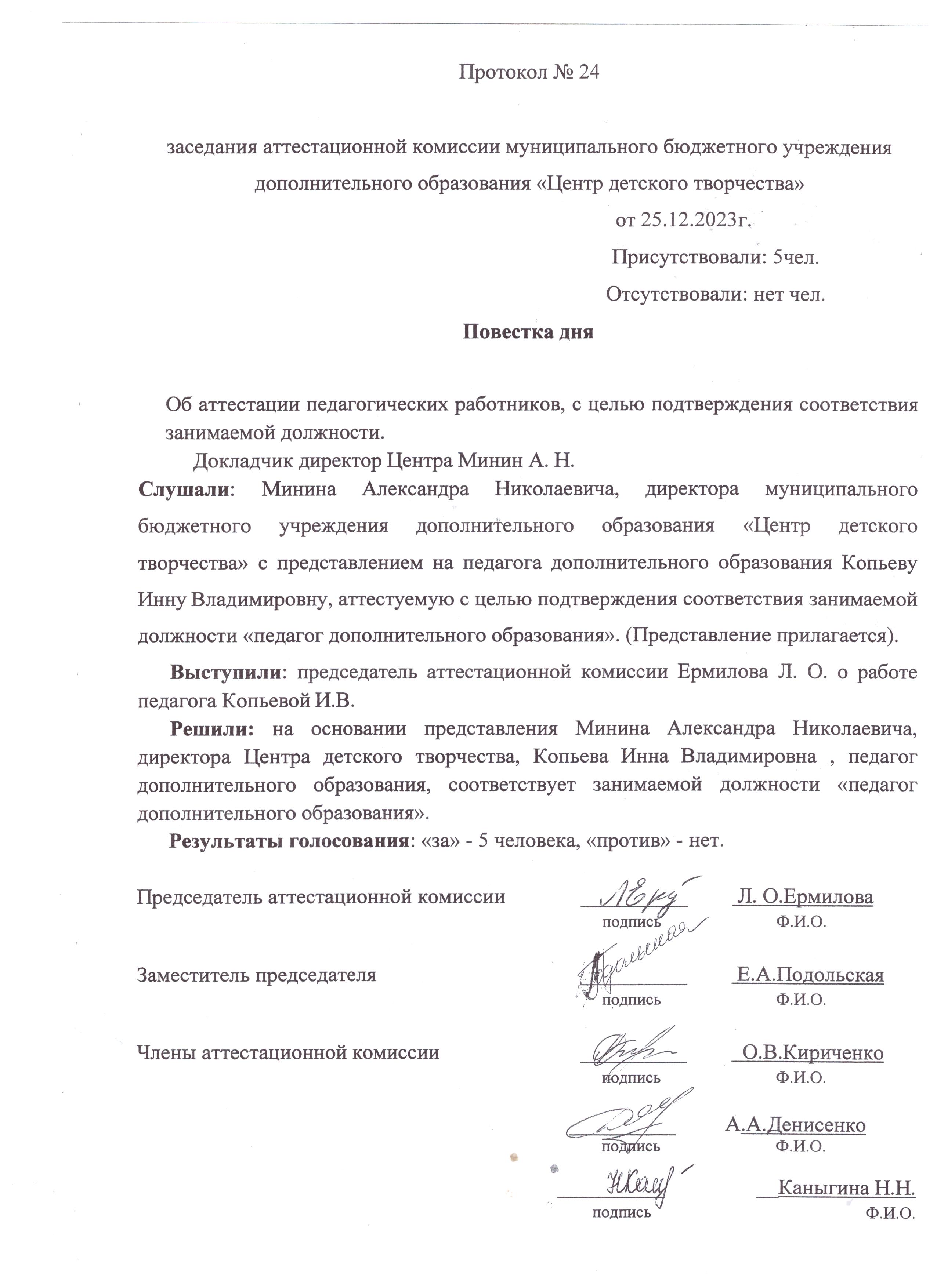 Протокол № 24 заседания аттестационной комиссии МБУДО ЦДТ муниципального образования город Армавир от 25.12.2024 года