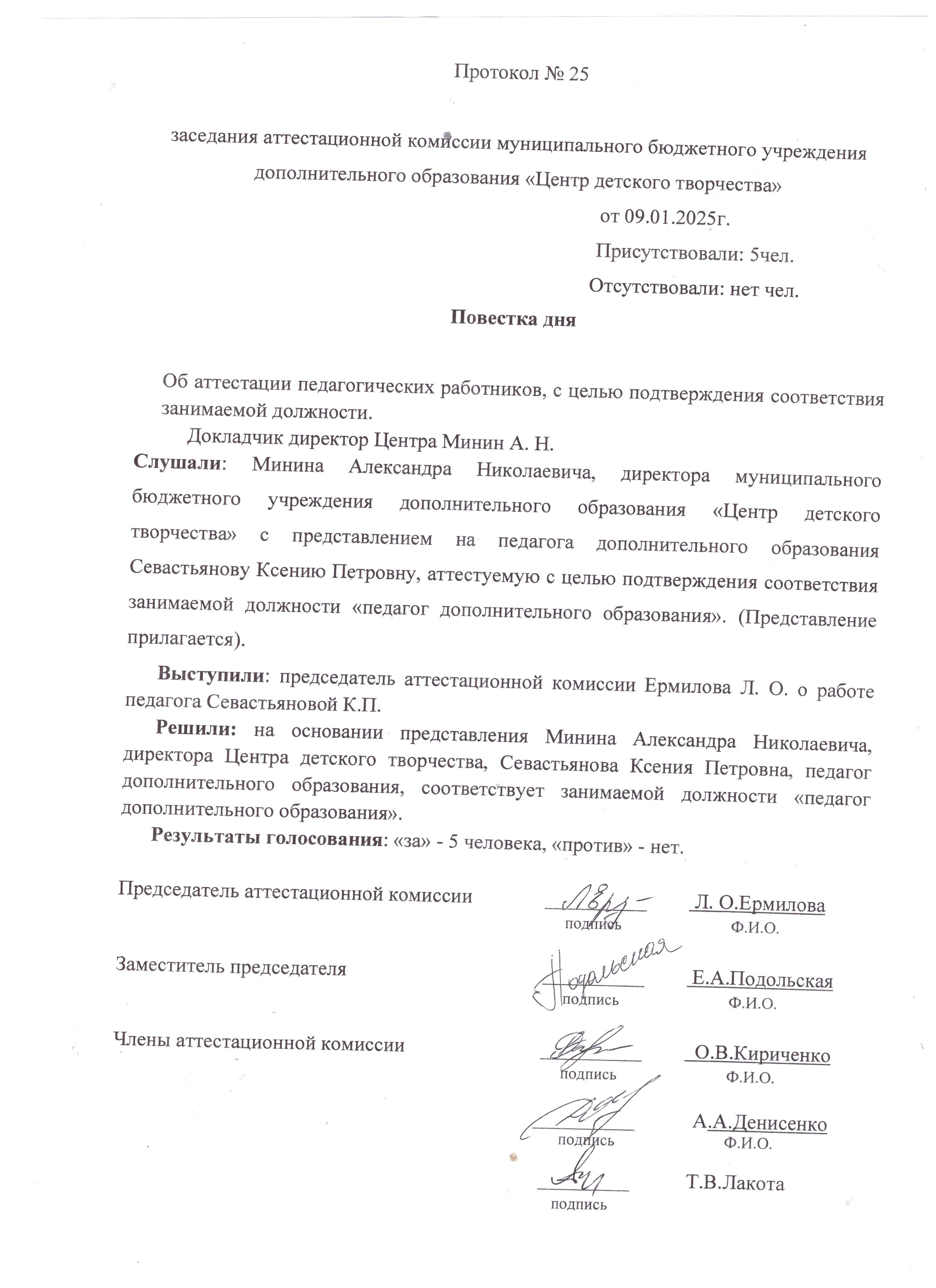 Протокол № 25 заседания аттестационной комиссии МБУДО ЦДТ муниципального образования город Армавир от 09.01.2025 года