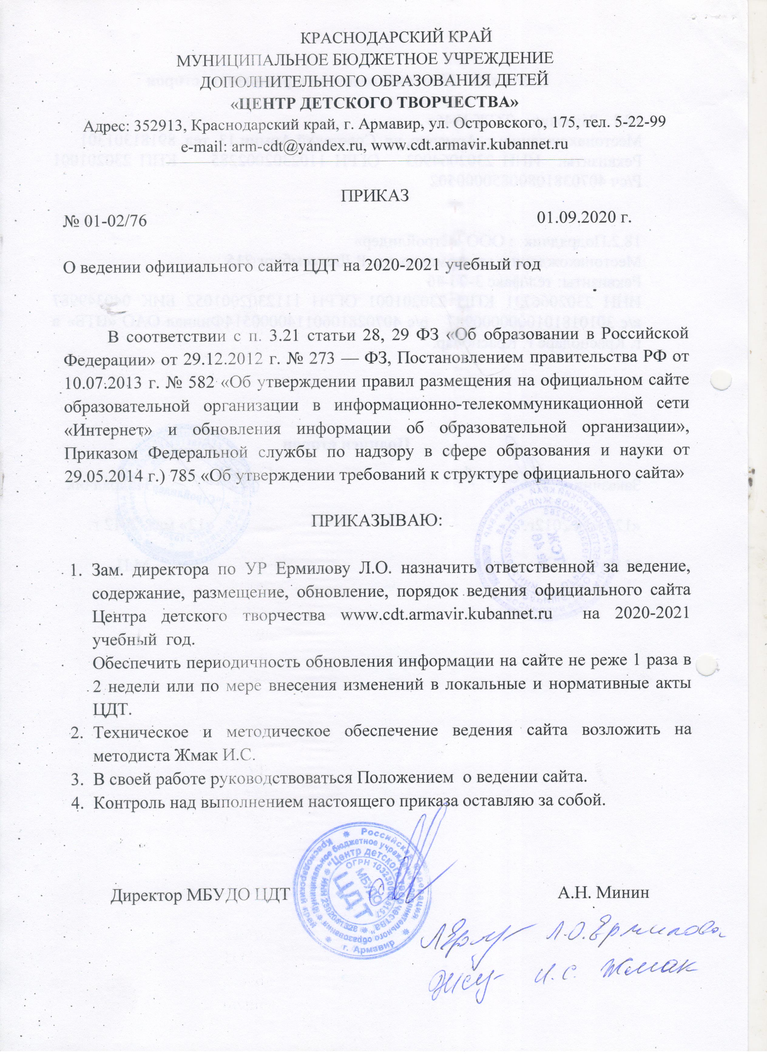 - Приказ о ведении официального сайта ЦДТ