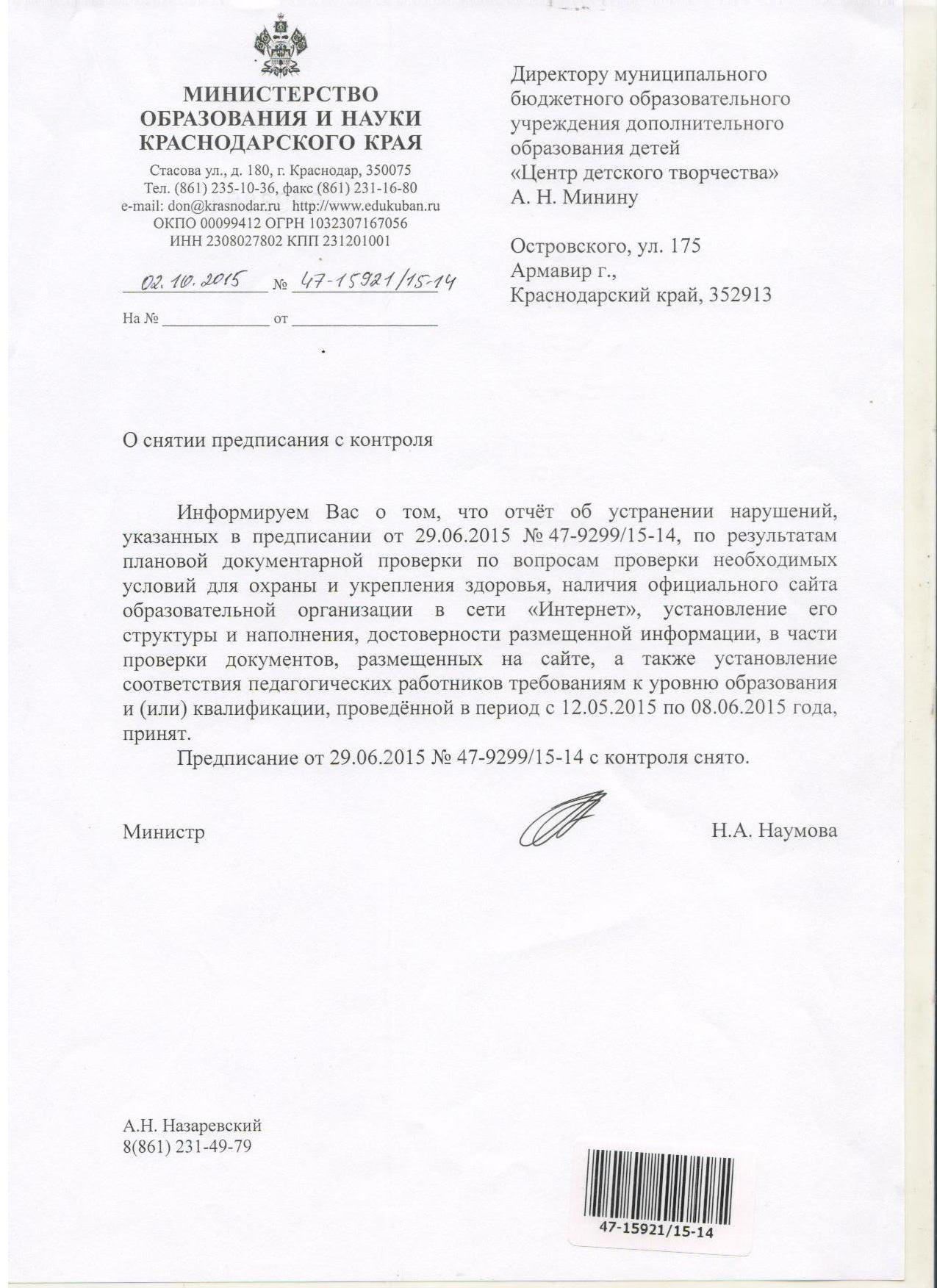 - О снятии с контроля Министерства образования и науки Краснодарского края предписания к МБУДO ЦДТ от 02.10.2015 года