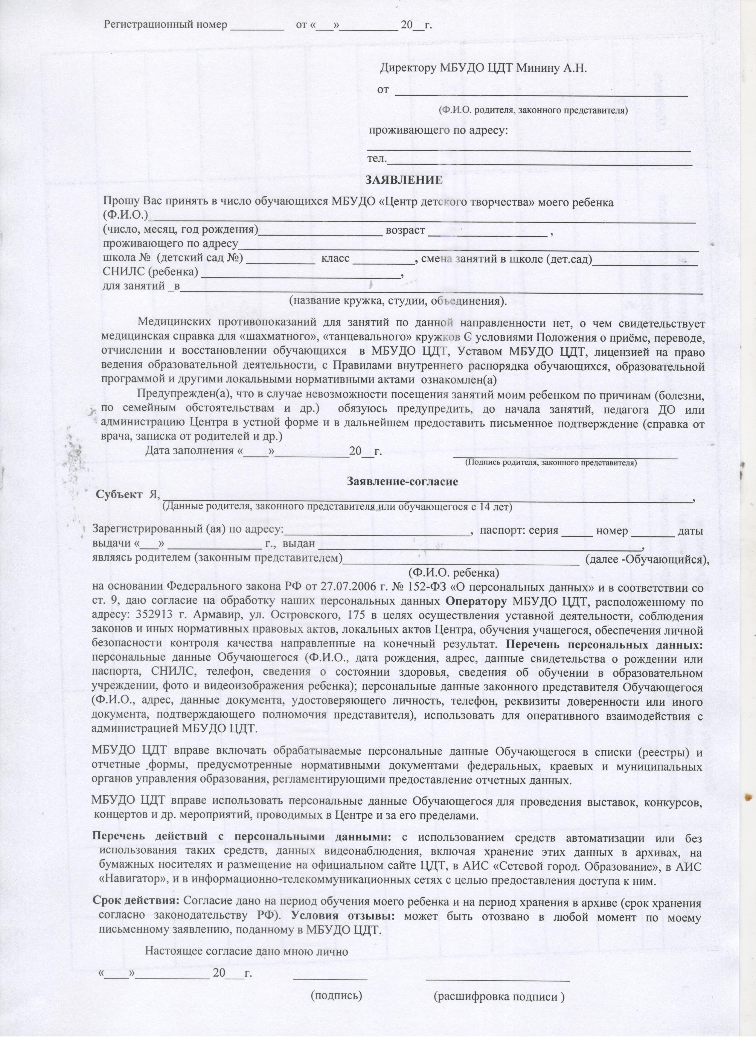 - Образец заявления для занятия в кружках, объединениях