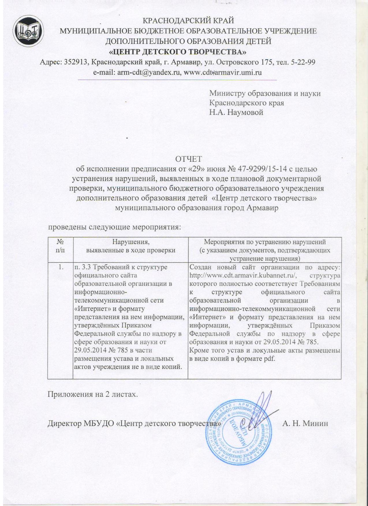 - Отчёт МБОУДОД ЦДТ о выполнении предписания Министерства образования и науки Краснодарского края