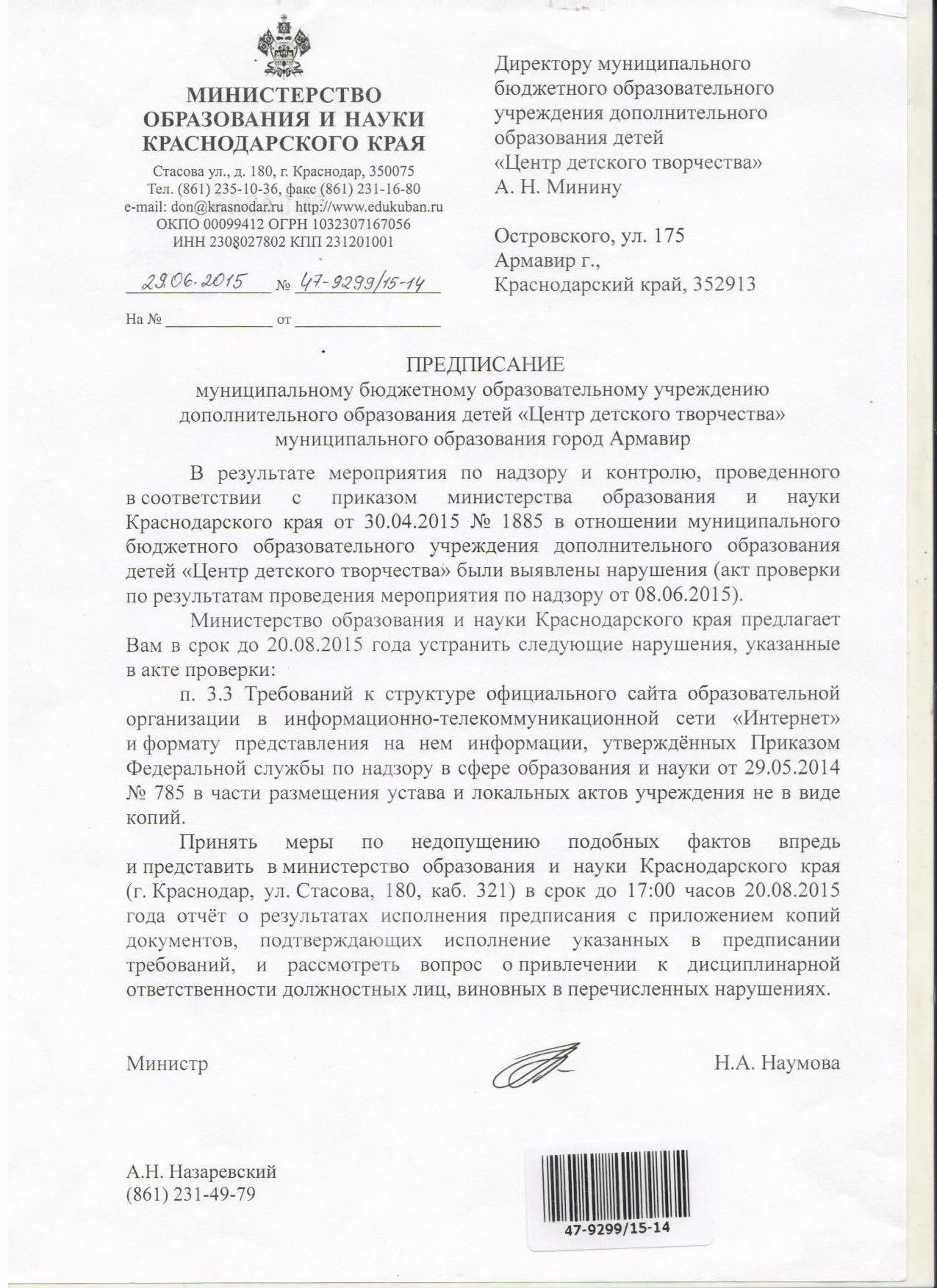 - Предписание Министерства образования и науки Краснодарского края от 29 июня 2015 года